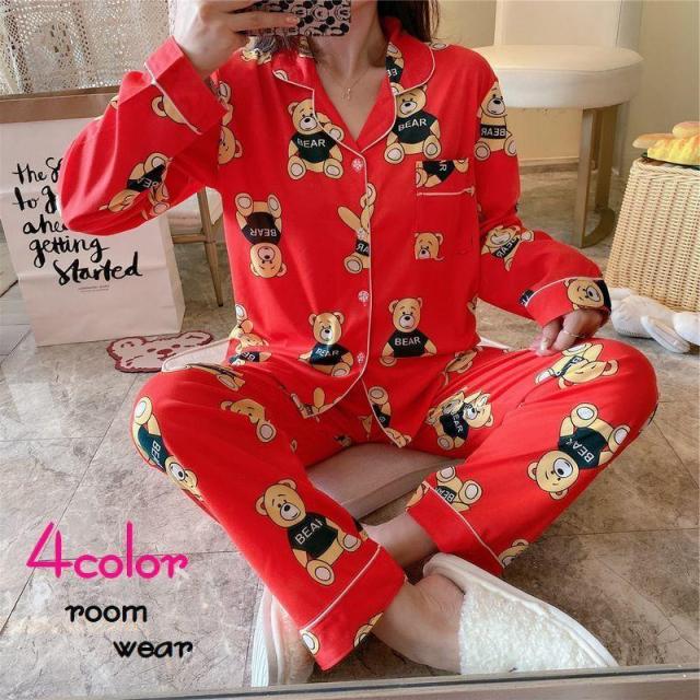 パジャマ レディース 女性用 ルームウェア 寝巻 部屋着 長袖 長ズボン 上下セット 前ボタン かわいい チェック くま ベア 胸ポケット