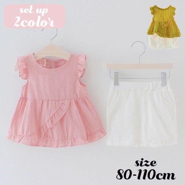 セットアップ 上下セット ブラウス ノースリーブ ショートパンツ キッズ ベビー 子供 女の子 フリル ドット 水玉 ペプラム かわいい イエロー ピ