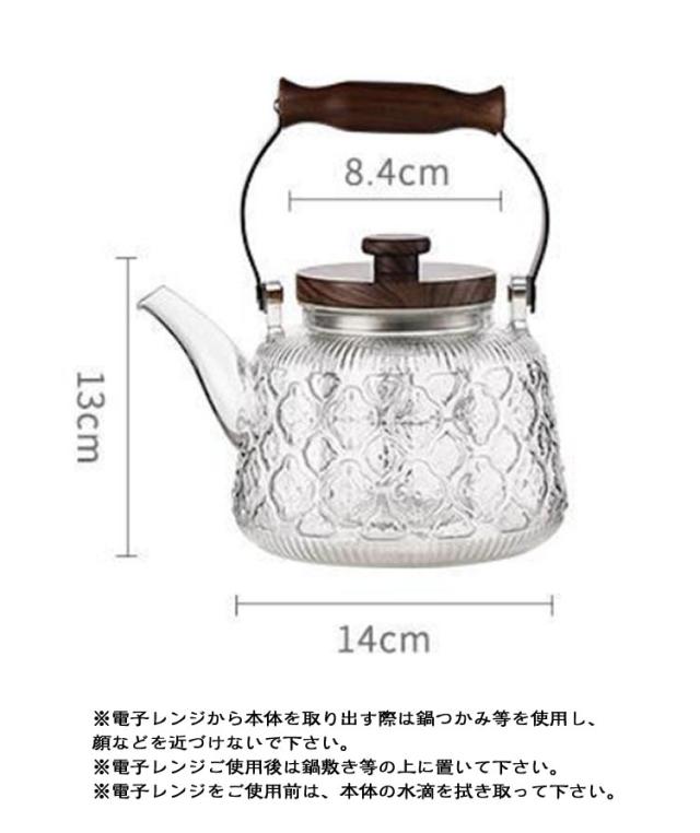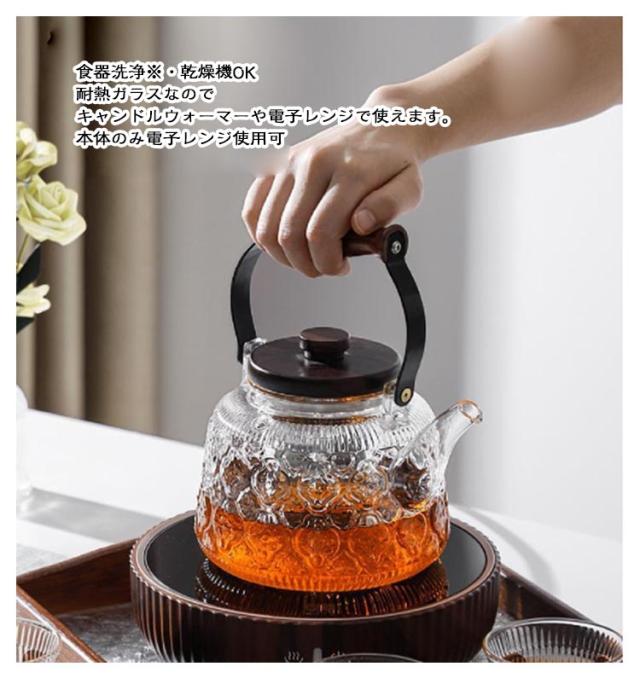 | 茶漉し付き 直火・電子レンジOKな美しいガラスのケトル ■着脱が簡単なガラス製金針式茶漉し付き 茶葉の持つ香りと味を十分に引き出す設計 丸型の形状に、茶漉しは注ぎ口に挿入するワイヤー式のため、茶葉がジャンピングしやすくなっています。 ■透明度が高く、ポットの中の様子が見えるため、緑茶、紅茶、ハーブティー、お花のお茶、フルーツティー…などなど、いろんなお茶を見て愉しむこともできます。 また、把手は銅製なので使い込んでいくと味わい深く変化していきます。 400度まで耐えることができますが、弱火をおススメ。ただし耐熱温度以下であっても、温度差が大きい場合には割れが発生する可能性もありますので、注意が必要です 食器洗浄※・乾燥機OK 耐熱ガラスなのでキャンドルウォーマーや電子レンジで使えます。 本体のみ電子レンジ使用可 電子レンジでのご使用の注意 ※電子レンジで使用する際は茶こしを外して下さい。 ※空の状態で使用しないで下さい。 ※突然一気に煮沸して激しく吹き出す恐れがあります。 ※電子レンジから本体を取り出す際は鍋つかみ等を使用し、顔などを近づけないで下さい。 ※電子レンジご使用後は鍋敷き等の上に置いて下さい。 ※電子レンジをご使用前は、本体の水滴を拭き取って下さい。 | |