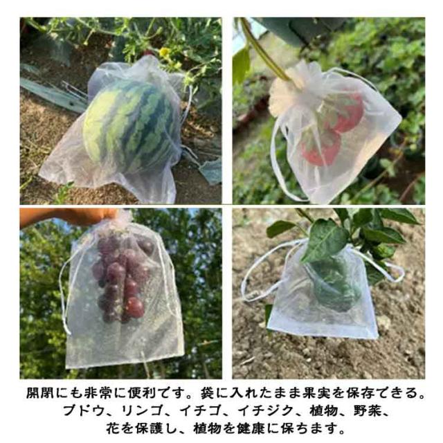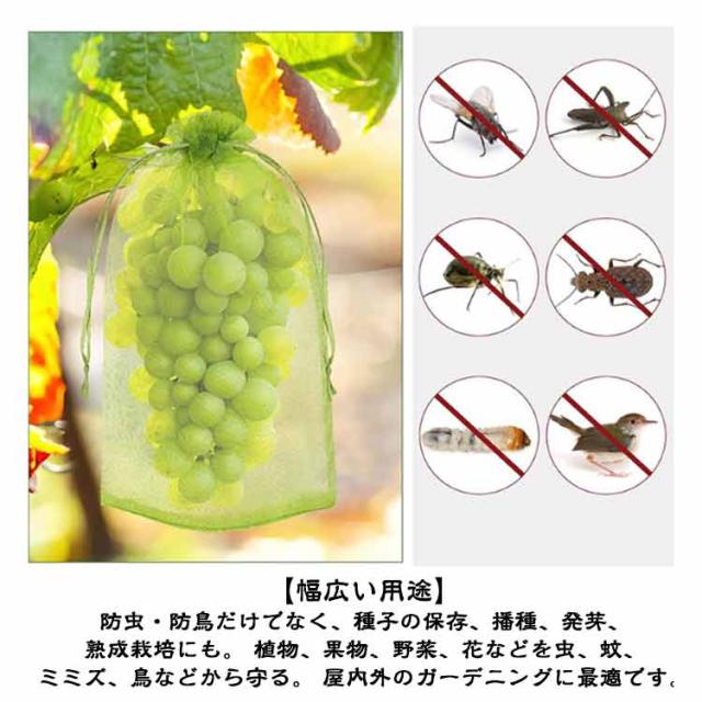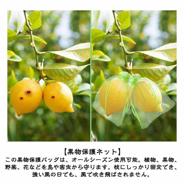 | 幅広い用途】防虫・防鳥だけでなく、種子の保存、播種、発芽、熟成栽培にも。 植物、果物、野菜、花などを虫、蚊、ミミズ、鳥などから守る。 屋内外のガーデニングに最適です。 【通気性のメッシュ素材】丈夫な素材で作られた果物袋は、耐腐食性と耐久性に優れ、頑丈なのが特徴です。メッシュデザインは、光合成を妨げないため、野菜や果物の日光の吸収がよくなり、健康に育つことができます。 【果物保護ネット】この果物保護バッグは、オールシーズン使用可能。植物、果物、野菜、花などを鳥や害虫から守ります。枝にしっかり固定でき、強い風の日でも、風で吹き飛ばされません。 【巾着設計】フルーツメッシュバッグは巾着タイプなので、しっかり閉じることができます。開閉にも非常に便利です。袋に入れたまま果実を保存できる。ブドウ、リンゴ、イチゴ、イチジク、植物、野菜、花を保護し、植物を健康に保ちます。 【害虫鳥避け】果物保護袋は、ミバエ、鳥、カラスを防ぐことができます。虫よけ、鳥よけにはなる。果樹のカラス、ヒヨドリ対策。このタイプはメッシュのテグスが太くしっかりしており、袋状に被せることができるタイプで、効果バツグンでした。 | |