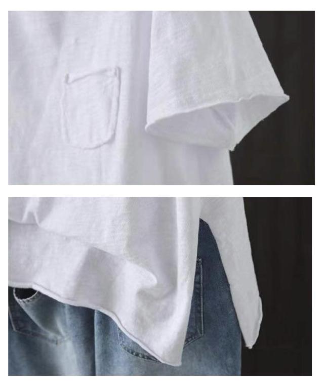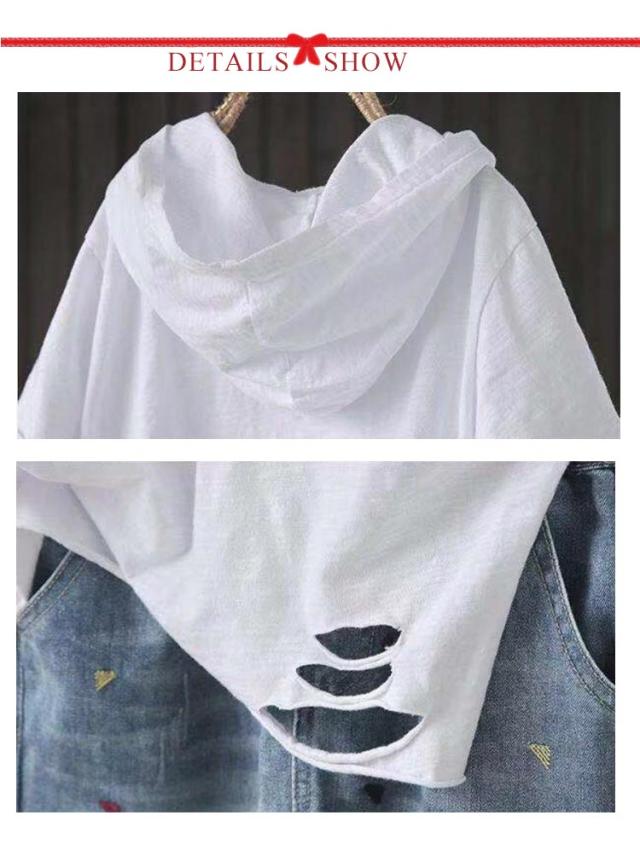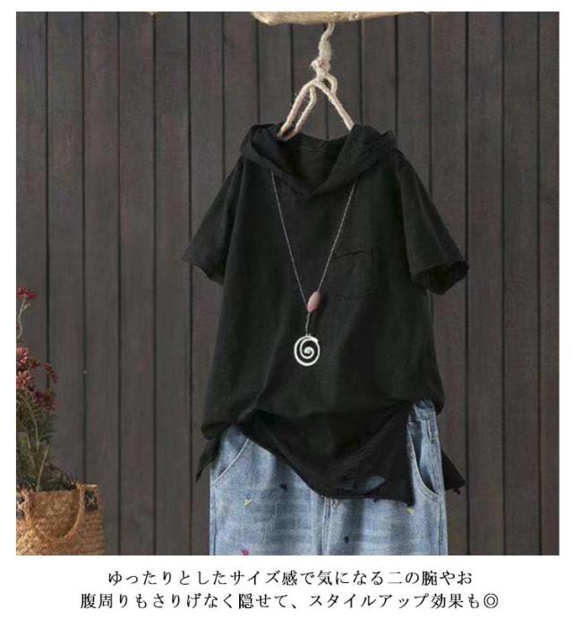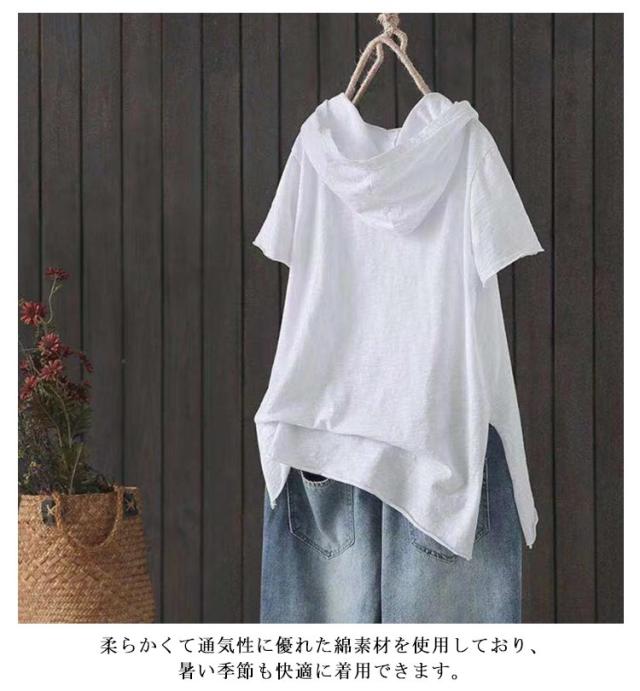 コットン Tシャツ 綿 夏 ダメージ加工 トップス ロングT ゆったり レディース フードTシャツ 半袖 Tシャツ 体型カバー 夏服 白 黒 シンプル お洒落