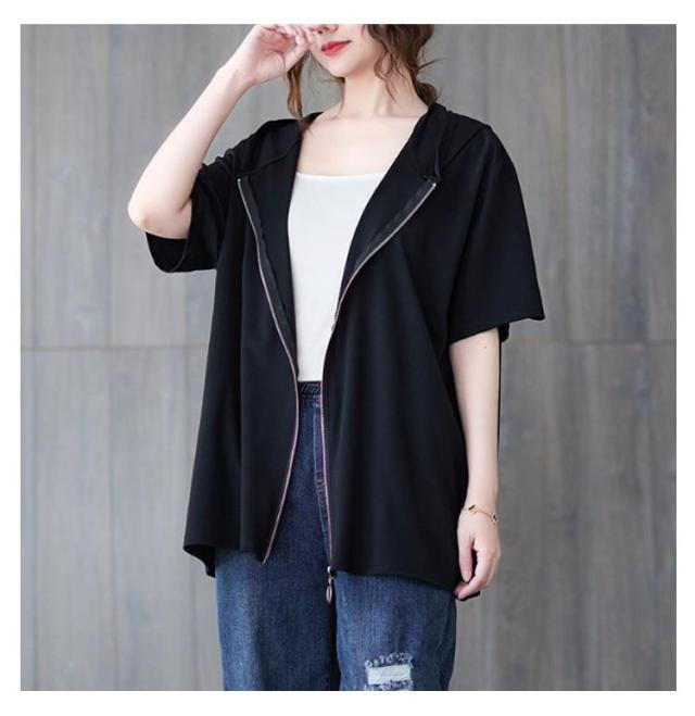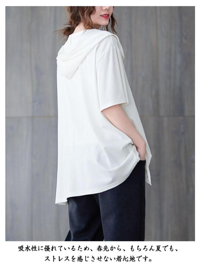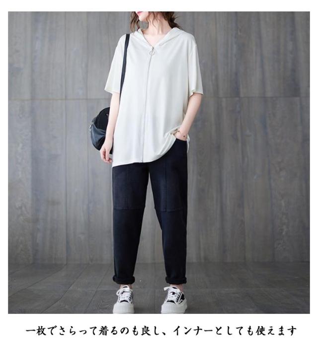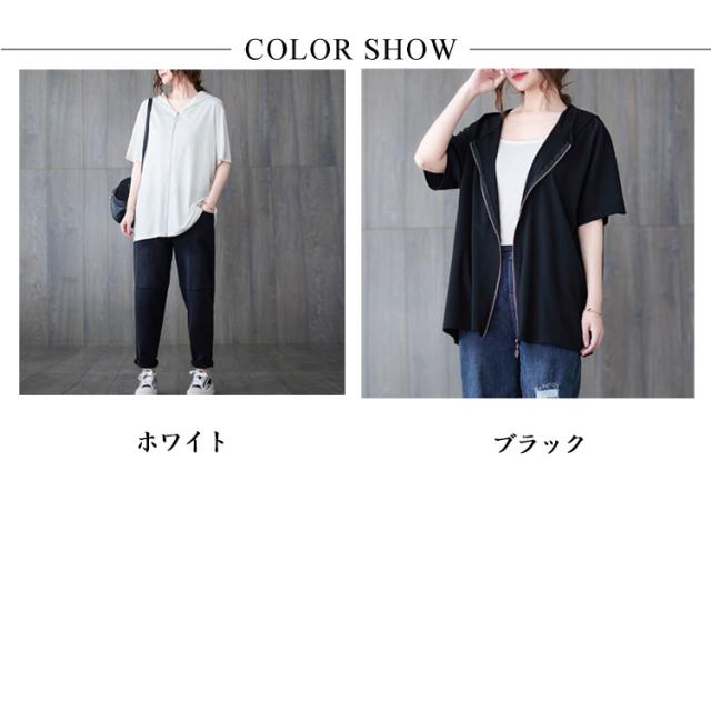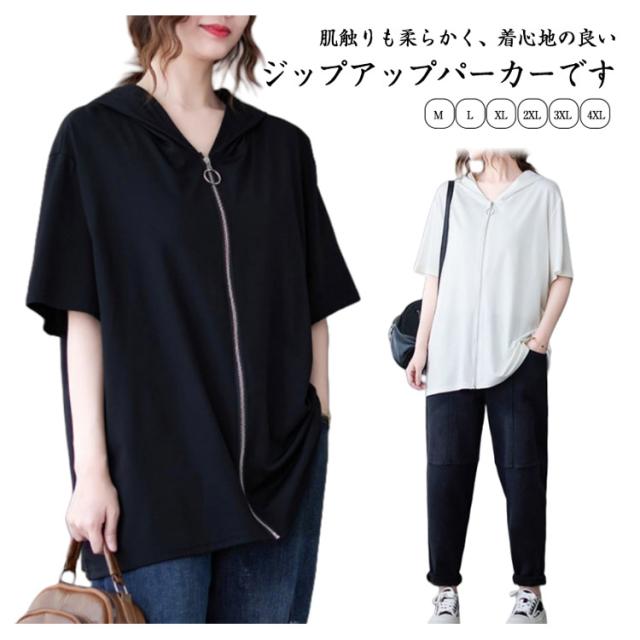 ジップアップ 夏物 半袖 パーカー カジュアル 前開き レディース 羽織り フード付き トップス カジュアル Tシャツ シンプル ゆったり お洒落 大人 パーカー 体型カバー 大きいサイズ