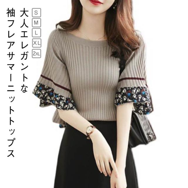 袖フレア サマーニット レディース 半袖 ニットプルオーバー フレアスリーブ 半袖ニット ニットソー トップス ニット 半袖 ニットトップス カットソー 春 半袖ニット 夏 tシャツ ゆったり 秋 大人可愛い シンプル きれいめ カジュアル フェミニン おしゃれ
