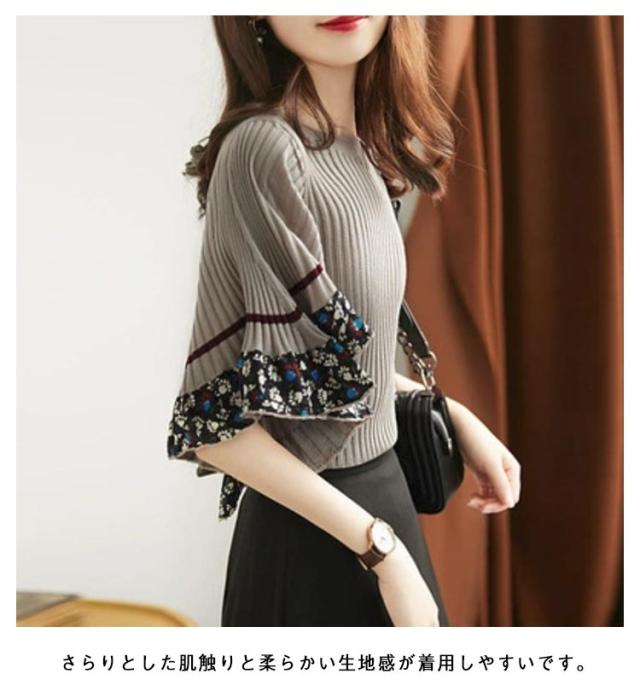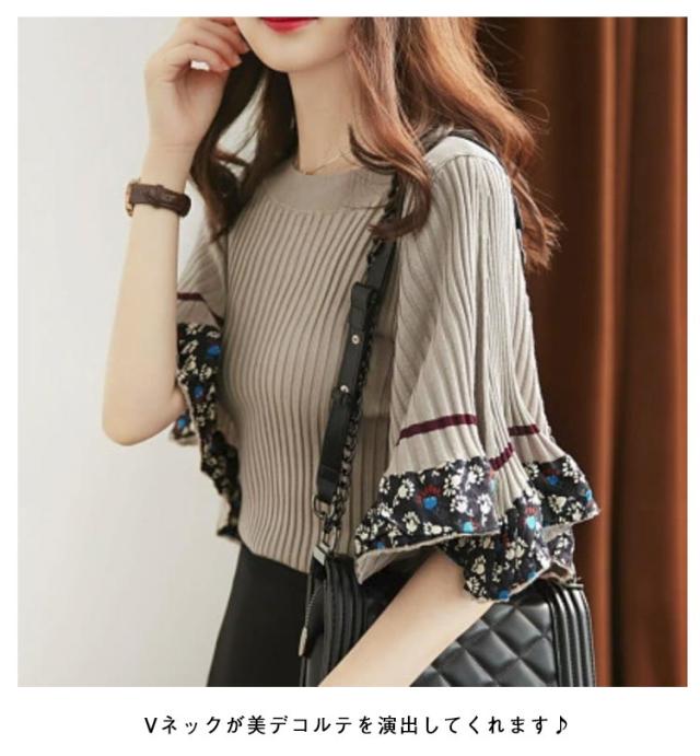 | 大人エレガントな袖フレアサマーニットトップス 袖口にが可愛らしいデザインニット フレアスリーブで気になる腕周りもカバーしてくれて女性らしさを引き立たせるポイントに◎。 Vネックが美デコルテを演出してくれます♪ さらりとした肌触りと柔らかい生地感が着用しやすいです。 | |