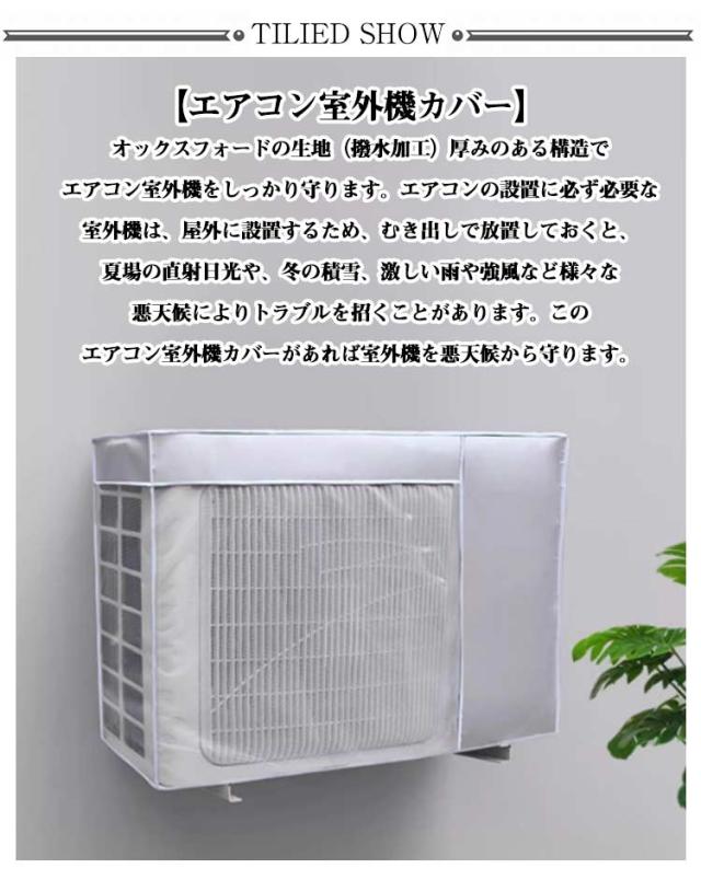 | 【エアコン室外機カバー】オックスフォードの生地(撥水加工)厚みのある構造でエアコン室外機をしっかり守ります。エアコンの設置に必ず必要な室外機は、屋外に設置するため、むき出しで放置しておくと、夏場の直射日光や、冬の積雪、激しい雨や強風など様々な悪天候によりトラブルを招くことがあります。このエアコン室外機カバーがあれば室外機を悪天候から守ります。 【汚れ・劣化防止】エアコンの室外機を直射日光から保護するカバーは、紫外線だけでなく雨やホコリなども防いでくれるとともに、室外機自体の老朽化防止効果も期待できます。室外機カバーがあれば室外機を悪天候によるトラブルから簡単にガードできます。この改良した室外機カバーでは、網も付いてあり、飛散した葉やゴミが室外機の中に入り込むのを防ぎます。 【遮熱・負担軽減】最新型の改良したエアコン室外機遮熱カバーでは、光反射素材を採用、約40%の熱線をカットし、冷房運転中の室外機の負担を軽くする!直射日光から室外機を守り、 冷房効率のUPを助けます。エコ・節電も期待できる優れな製品です。 【省エネ・取付け簡単】省エネ最新設計のエアコン室外機カバーは、厚みのある構造でしっかり断熱直射日光を遮り、廃熱効果が高まりますので節電・省エネ対策になります。設置し易く、取り外しも簡単です。カバー下部に固定用紐があって縛ることによって取付固定されます。また使用しない時にはコンパクトに収納でき、劣化して処分する際も便利です。 【悪天候対策】このエアコン室外機遮熱カバーは撥水加工生地を採用しているので、雨水を撥ね付け、泥やホコリなどがこびりつくのを防止できます。直射日光、雨、雪などの過酷な環境から室外機を守ってくれ♪雨天でも快適に過ごせます。耐候性に優れているので、オールシーズンOK!台風や、梅雨などの雨の季節には飛散した泥水や葉が室外機中に入り込むのを防ぎます。縛っておけば台風でも飛んで行かないし、寒冷地で積雪にも耐えて破損もしてないので堅牢性が高いです。(ご注意事項:室外機側面などの「通風孔」をふさがずにご利用ください。) | |