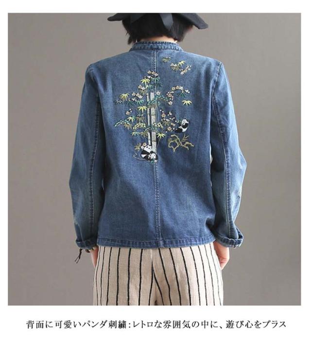 | チャイナ風デニムジャケット パンダ刺繍入り・ノーカラー・チャイナボタン ノーカラーデザイン:首元がすっきり、春夏秋にぴったりの軽やかデザイン チャイナボタン(盤扣)付き:、個性的なアクセントに 背面に可愛いパンダ刺繍:レトロな雰囲気の中に、遊び心をプラス 体型を選ばないゆったりシルエット:大きめサイズで楽ちんな着心地 柔らかいデニム生地:ごわつかず、軽やかな羽織りとして活躍 着回し自在なカジュアルアウター:外出・お散歩・旅行にもおすすめ | |