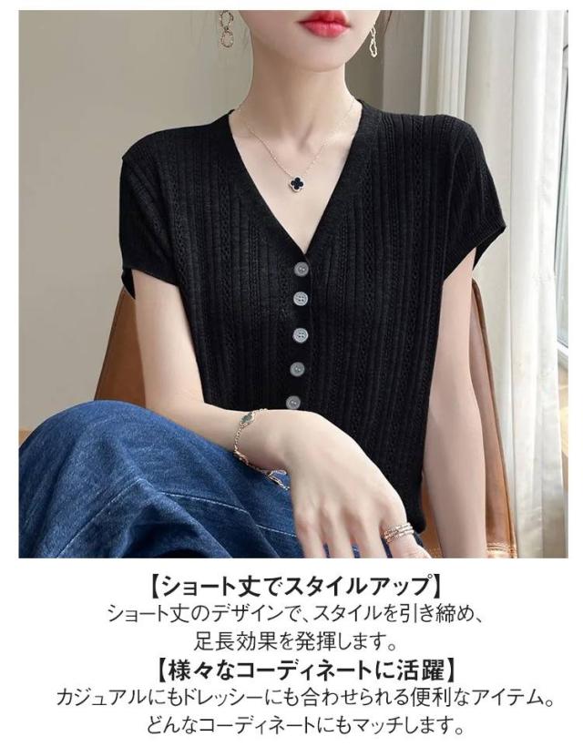 Vネックトップス おしゃれ 半袖 サマーカーディガン 薄手カーディガン 透かし編み 春夏 サマーニット シンプル 春夏 30代 40代