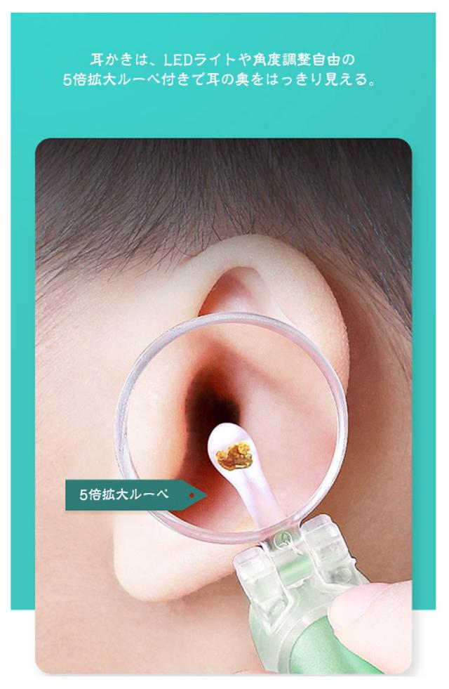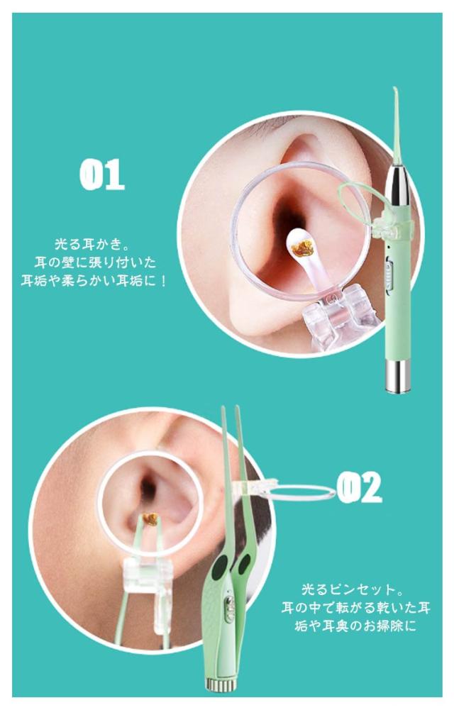 | LEDライト付き耳鼻掃除便利な3点セット。 光る耳かき。耳の壁に張り付いた耳垢や柔らかい耳垢に! 光るピンセット。耳の中で転がる乾いた耳垢や耳奥のお掃除に 光る鼻用ピンセット。お鼻のお手入れに!耳かきは、LEDライトや角度調整自由の5倍拡大ルーペ付きで耳の奥をはっきり見える。 皮膚に優しいシリコン製耳かきの先端パーツが2本付き赤ちゃんの繊細な耳道を傷つけません。 充電式なのでとても便利! スリムなケース付き便利に運び持ち、清潔に保管もできる。 耳かきの先端パーツ4本、ステンレス製耳かき2本付き。 | |