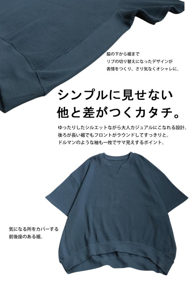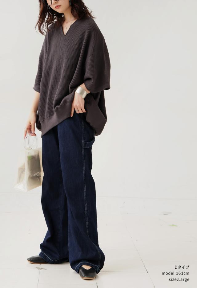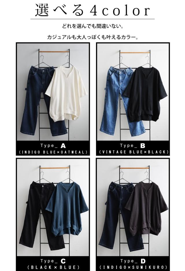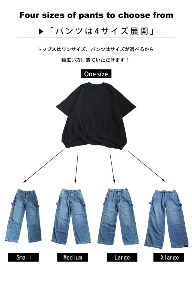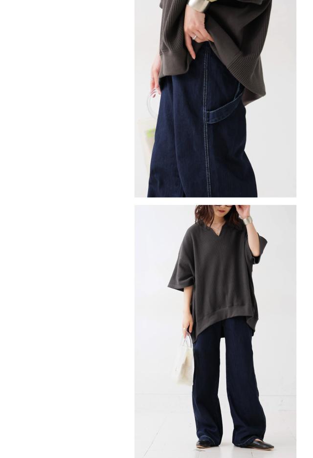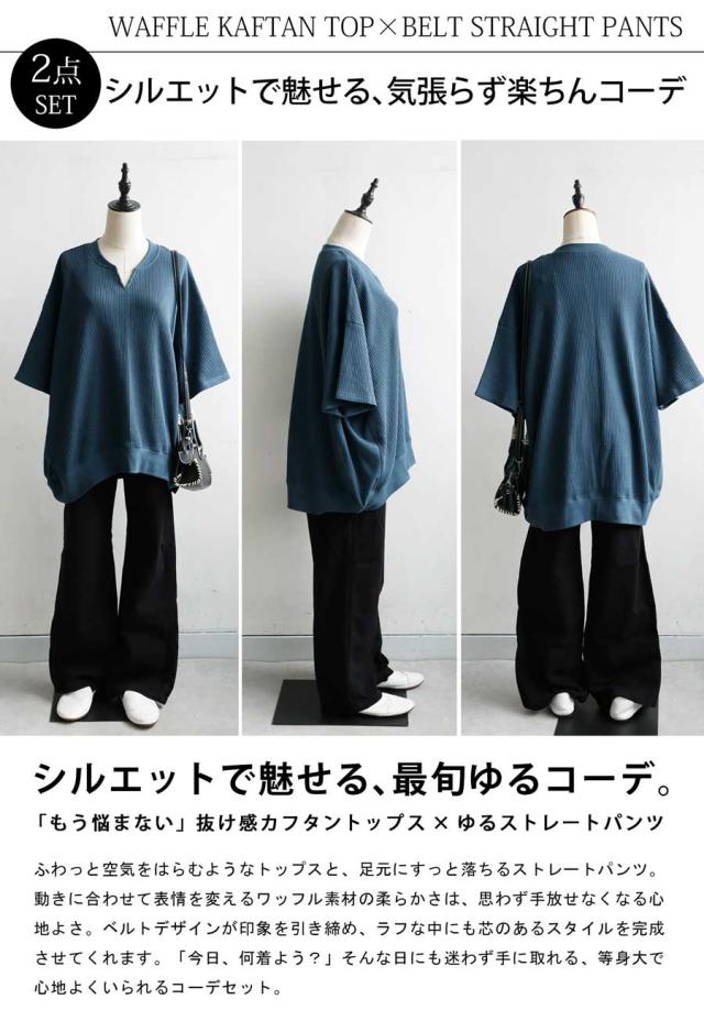 code-00047 レディース セットアップ カフタン トップス プルオーバー トレーナー 半袖 パンツ デニム ワッフル 体型カバー オニワッフル 春 夏 カジュアル ナチュラル