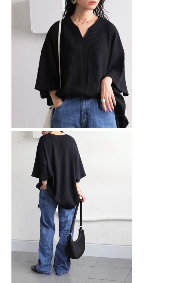 トップスはゆったりとしたシルエットに深めのVネックを施し、顔まわりをすっきりと見せるバランスに。