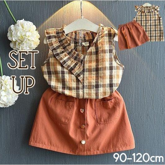 セットアップ 上下セット 2点セット キッズ 子供服 女の子 ノースリーブ Vネック ブラウス プルオーバー チェック柄 台形スカート ウエストゴム