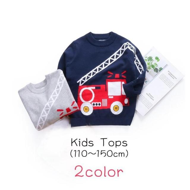 セーター キッズ ジュニア 子供服 子ども服 男の子 女の子 トップス 長袖 袖リブ 裾リブ 丸首 ラウンドネック プルオーバー イラスト 消防車 働