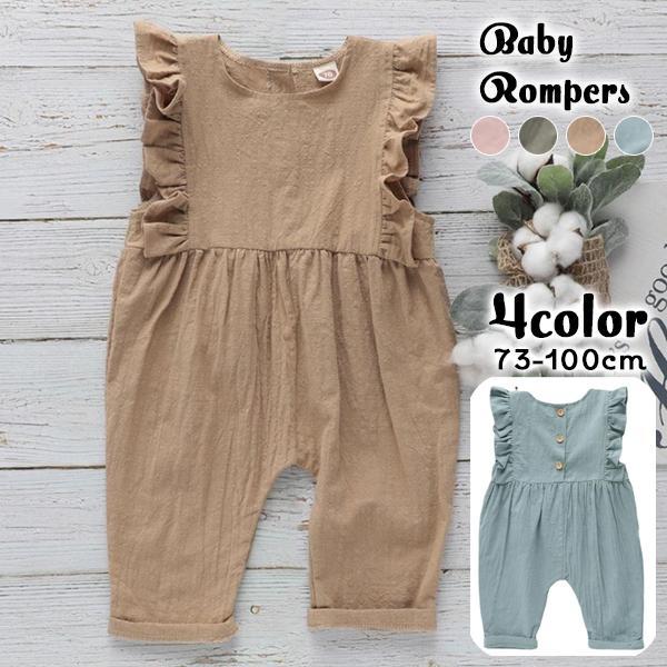 カバーオール ロンパース つなぎ 子供服 ベビー キッズ 女の子 ノースリーブ 長ズボン オールインワン ラウンドネック 肩フリル ナチュラル おしゃ