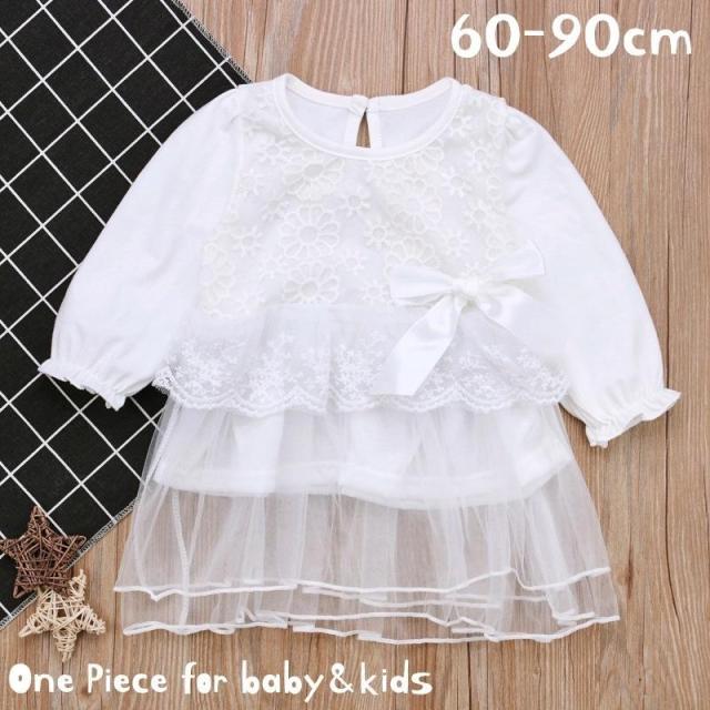 ワンピース 長袖 Aライン 女の子 ベビー キッズ 女児 ラウンドネック レース 花柄 リボン ベルスリーブ 透け感 シースルー シンプル 可愛い お