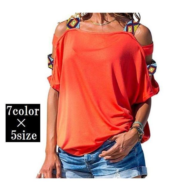半袖カットソー オフショルダー レディース トップス Tシャツ 肩出し キャミソール風 幾何学模様 腕魅せ 肩魅せ プルオーバー シンプル 無地 柄な