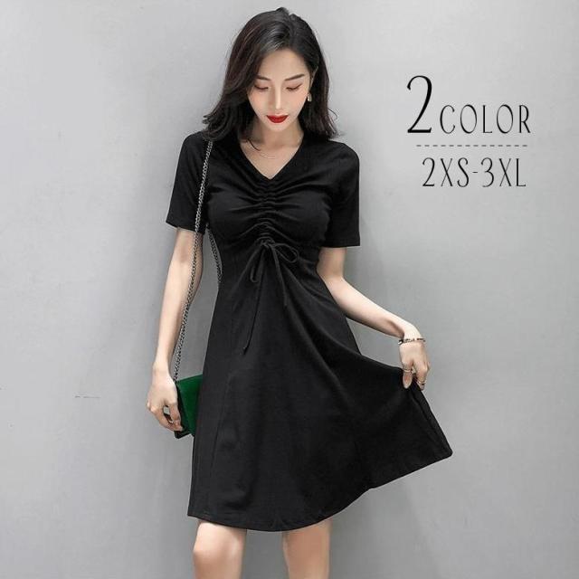 ワンピース レディース 半袖 リボン ドロスト シンプル 無地 ミディアム丈 ミニ丈 フレア Vネック かわいい おしゃれ 女性 婦人服 大きいサイズ