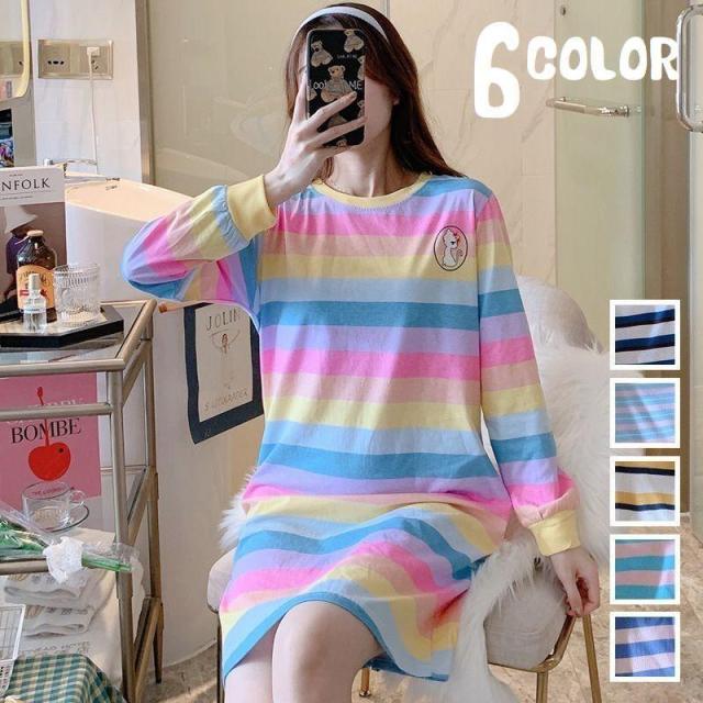 ルームウェア レディース ワンピース 長袖 クルーネック ボーダー 横縞 プリント ネコ 猫 パジャマ 部屋着 婦人服 かわいい