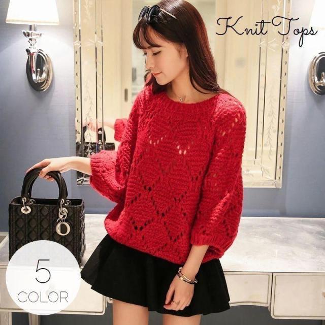 ニットトップス ざっくりニット セーター レディース ニット トップス 7分袖 ざっくり ひし形 ラウンドネック バルーンスリーブ バルーン袖 透け感