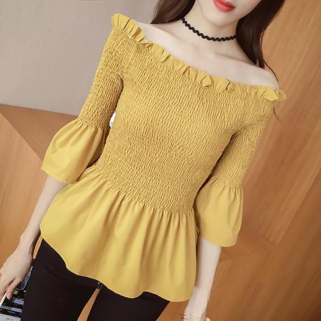 オフショルダーブラウス 7分袖ブラウス ペプラムブラウス プルオーバーブラウス レディース トップス 春夏 無地 黒 フレアスリーブ シャーリング フ