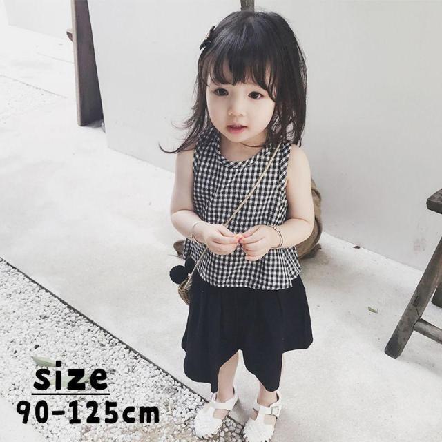 ノースリーブブラウス ワイドパンツ 2点セット キッズ トップス ボトムス 裾広がり ゆったり ガウチョ パンツ チェック 格子柄 ギンガムチェック