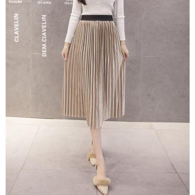 スカート プリーツ ロングスカート ミモレ丈 ベルベット調 ベロア 無地 ボトムス レディース エレガント 秋冬 シック ベイクドカラー落ち着いた 大