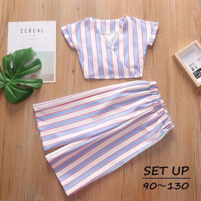 上下セット セットアップ 半袖 ショート丈 カシュクール Vネック ワイドパンツ 9分丈 長ズボン ストライプ へそ出し キッズ ダンス 衣装
