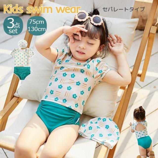 水着 3点セット キッズ ベビー 子ども 女の子 スイムウェア 上下セット セパレート 帽子付き スイムキャップ 半袖 ラッシュガード 花柄 フラワー