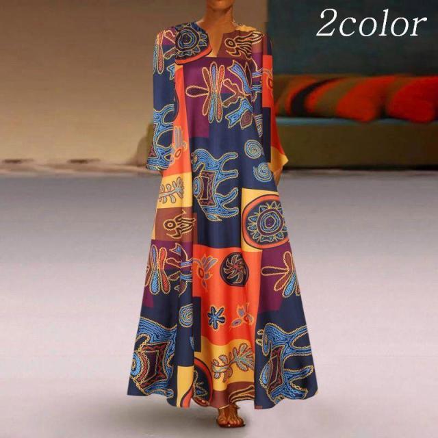 ワンピース レディース 女性用 7分袖 スリットネック マキシ丈 ロング丈 Aライン アジアンテイスト 民族衣装風 おしゃれ カラフル 個性的 ゆった
