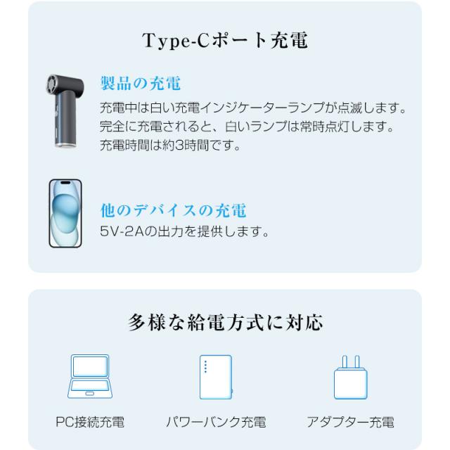 Type-Cポートを採用したデュアル機能設計により、本製品は自身が充電されるだけでなく、スマホや小型USB充電設備への緊急充電が可能です。4000mAhのバッテリー容量はiPhone 13 miniなら約1.5回のフル充電が可能。充電中でもファン機能を併用できるハイブリッド設計で、アウトドアや災害時にも重宝するマルチユース性を実現しました。