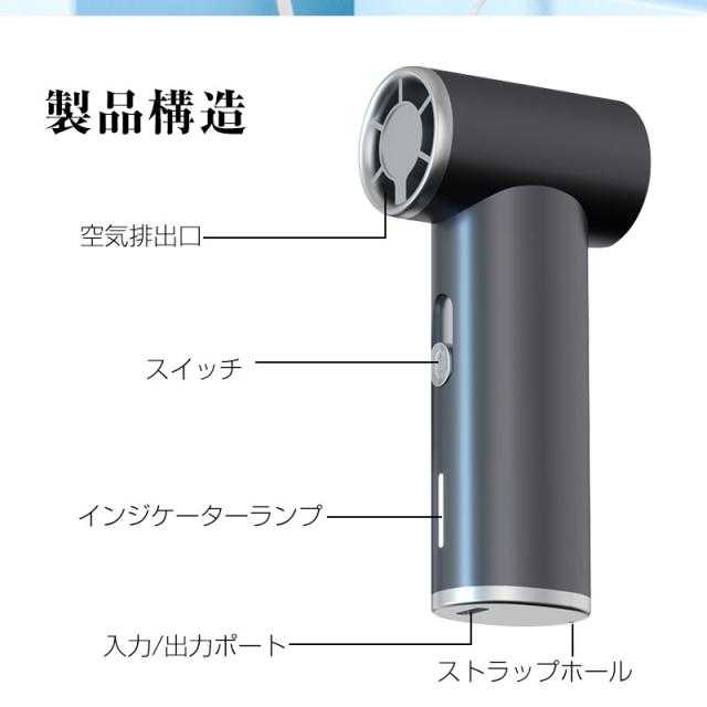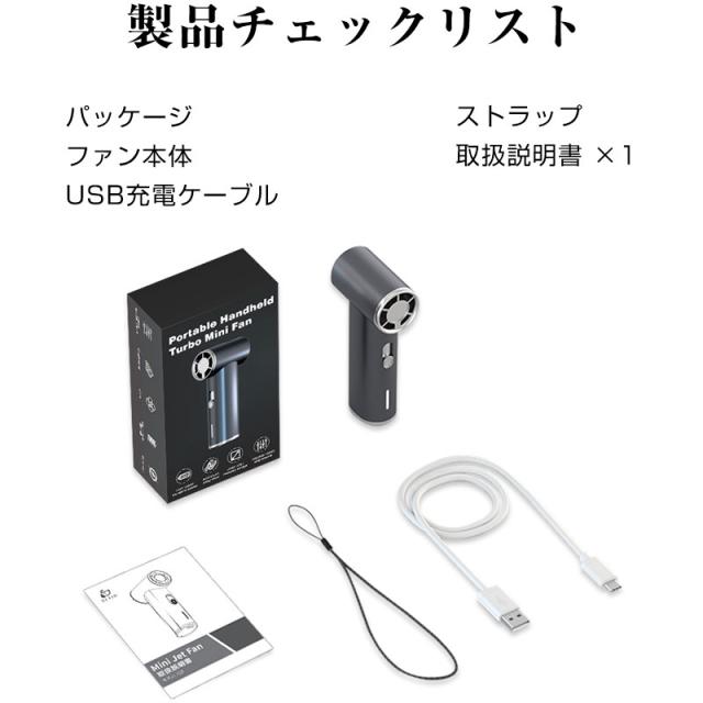 【パッケージ内容】手持ちターボファン本体、USB充電ケーブル、ストラップ、取扱説明書