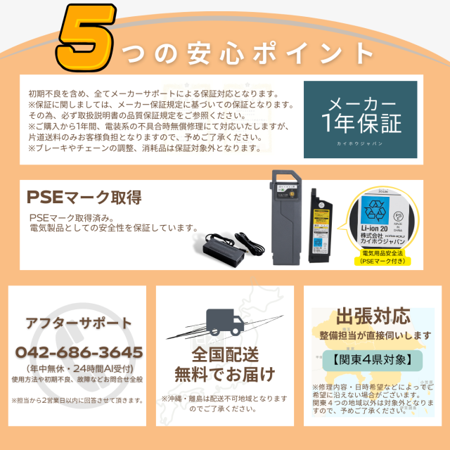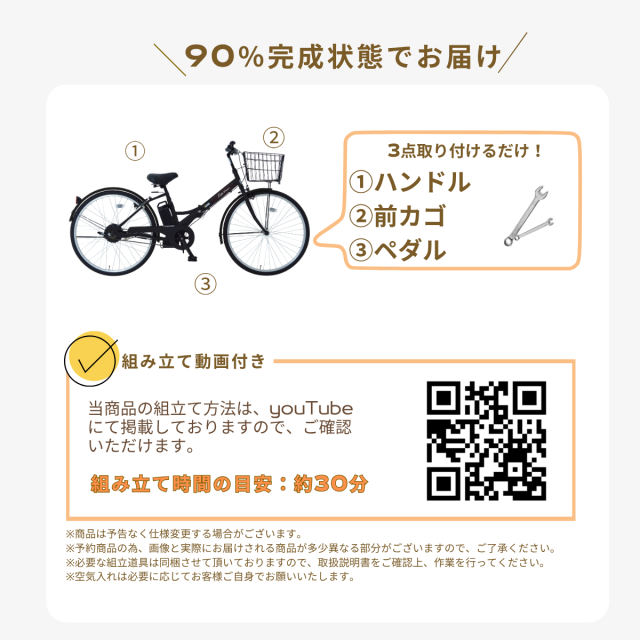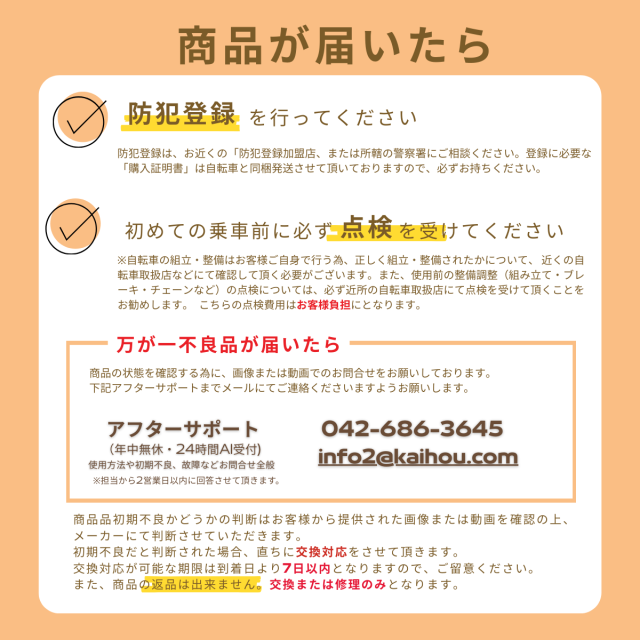 【初期不良・返品について】 出荷完了後の返品はお受付出来かねますので、予めご了承ください。 初期不良を含め全てメーカーサポートによる保証対応となります。 ■カイホウジャパンサポートセンター 電話番号:042-686-3645(24時間AIによる受付) 【自転車の初期整備・点検について】 本製品を受け取ったら、お客様自身で下記の組立作業を行う必要がございますので、必ずご確認ください。 ・ハンドルの取付け(ハンドルは取り外された状態でのお届けとなります) ・本体の組立 ・ペダルの取付け ※必要な組立道具は同梱させて頂いておりますので、取扱説明書をご確認上、作業を行ってください。 ※空気入れは必要に応じてお客様ご自身でお願いいたします。 【自転車取扱店などにて整備士による整備点検を受けてください】 メーカー直送品の場合、自転車の組立・整備はお客様ご自身で行う為、正しく組立・整備されたかについて、 近くの自転車取扱店などにて確認して頂く必要がございます。 大変お手数をお掛け致しますが、使用前の整備調整(組み立て・ブレーキ・チェーンなど)の点検については、 下記防犯登録手続きの際に、必ず近所の自転車取扱店にて点検を受けて頂くことをお勧めします。 【防犯登録手続きは近所の自転車取扱店にてお願いします】 ・購入した自転車車体 ・お買い上げ明細書(購入証明書) ・購入者の身分証明書 ・防犯登録に必要な費用(1000円未満) 【その他】 メーカー直送品の為、代引き決済が出来かねます。 |