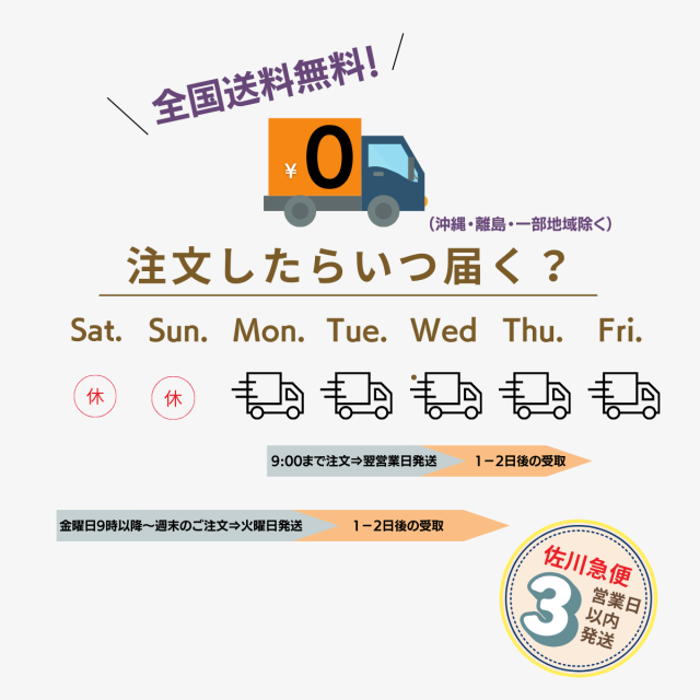 配送業者:佐川急便 ※ご注文決済後、3営業日以内に出荷いたします。 ※日時指定が出来かねますので、予めご了承ください。 ※沖縄・離島は配達不可となるため、ご注文は承れません、予めご了承ください。 |
