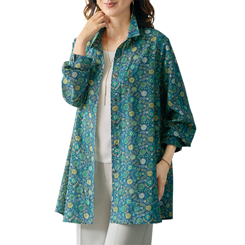 花柄プリント チュニックブラウス ブルー グリーン シャツ チュニック 長袖 レディース 婦人服 ミセス シニア 女性 青 緑 エスニック フラワー柄 綿混 体型カバー シャツジャケット シニアファッション 40代 50代 60代 70代 80代 90代 母の日 お母さん おばあちゃん 春物 夏物 春夏