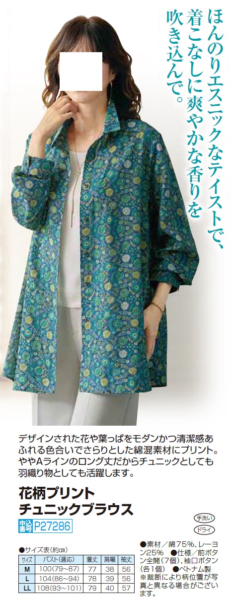 花柄プリント チュニックブラウス ブルー グリーン シャツ チュニック 長袖 レディース 婦人服 ミセス シニア 女性 青 緑 エスニック フラワー柄 綿混 体型カバー シャツジャケット ファッション 40代 50代 60代 70代 80代 90代 母の日 お母さん 春夏 nss p27286