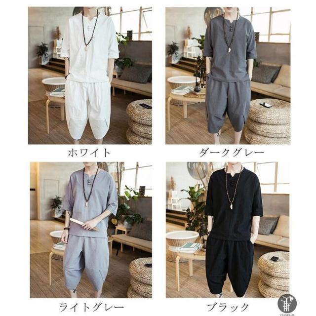 メンズ セットアップ 綿麻上下セット 薄手 リネン 七分丈サルエルパンツ ワイドパンツ ルームウェア 夏
