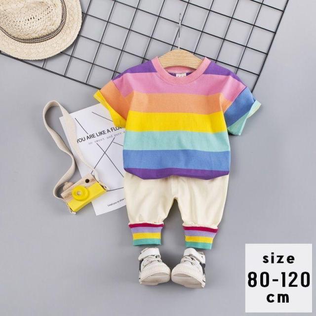 セットアップ 上下セット 2点セット キッズ ベビー 男の子 女の子 半袖 カットソー Tシャツ 長ズボン かわいい ボーダー レインボー 裾リブ ト