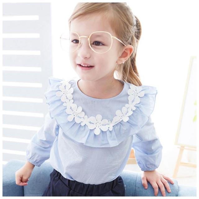 長袖ブラウス ストライプブラウス プルオーバーブラウス 子供服 トップス 春 秋 キッズ 女の子 女児 小学生 フラワーモチーフ フラワーレース フリ
