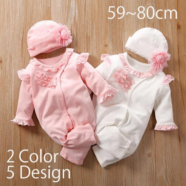ロンパース オールインワン ベビー 股開き 前開き ラウンドネック 長袖 可愛い おしゃれ 無地 花柄 レース フリル 帽子付き シンプル 外出 部屋