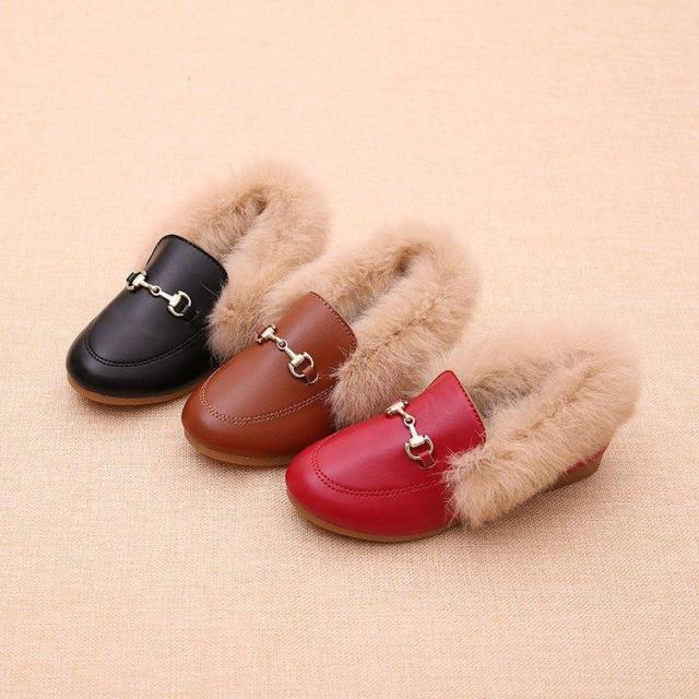 子供用 カジュアルシューズ ファー付きローファー ファースリッポン 靴 レザー調 フェイクファー キッズ用 フラットソール ぺたんこ フェイクレザー