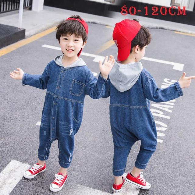子供服 キッズウェア つなぎ服 ロンパース ジャンプスーツ デニム フード付き フロント股下スナップ おしゃれ 無地 シンプル 長袖 かっこいい お出