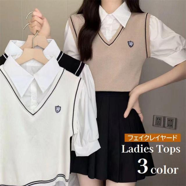 ブラウス 半袖 フェイクレイヤード ベスト レディース トップス ニット 異素材 ドッキング 重ね着風 パフスリーブ プルオーバー 襟付き 婦人服 女