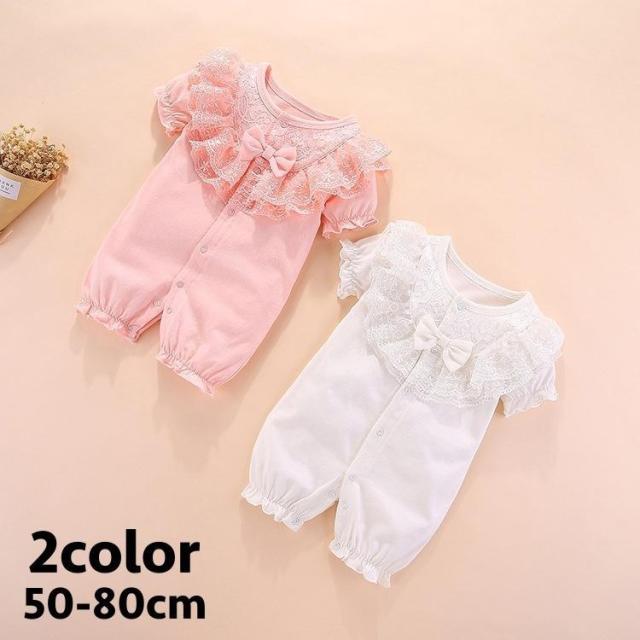 ロンパース カバーオール ベビー 赤ちゃん 新生児 幼児 女の子 つなぎ ボディスーツ 半袖 ベルスリーブ フリル レース リボン ボタン 可愛い キ