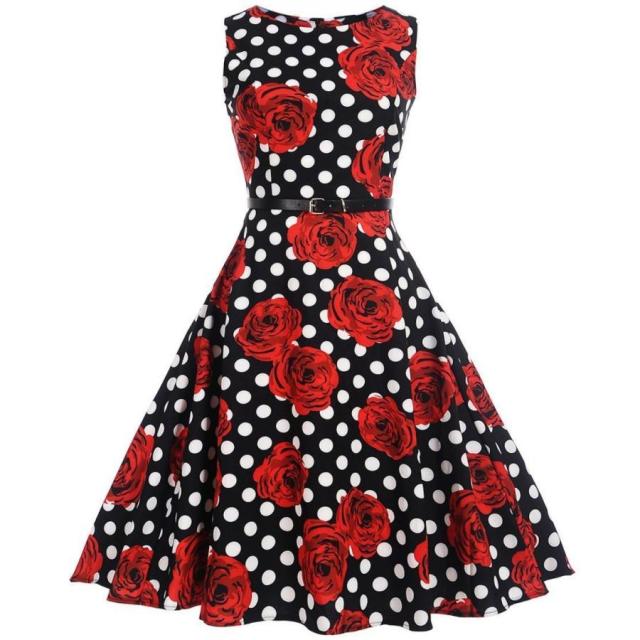 黒地に白の水玉、赤いバラが映える配色がステキなレディース用ノースリーブワンピースです。