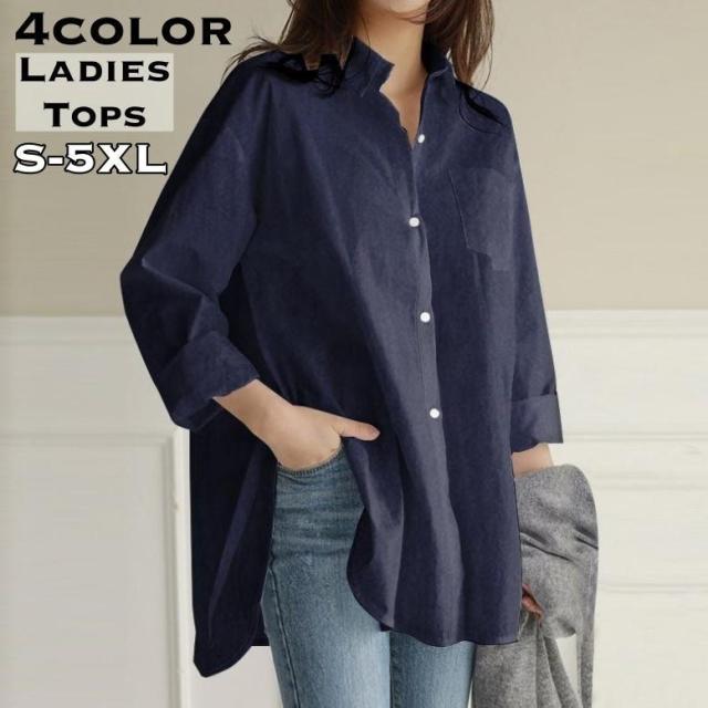 シャツ 長袖 チュニック レディース 女性 スタンダードカラー 前ボタン 前開き テールカット ラウンドヘム スリット 大きいサイズあり オーバーサイ