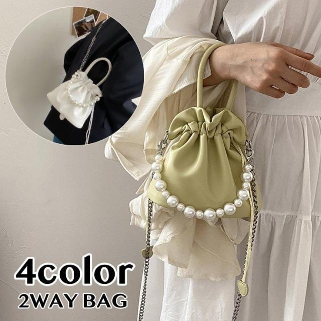ハンドバッグ ショルダーバッグ 2WAY レディース 女性用 巾着バッグ レザー調 フェイクパール 肩掛け 手提げ 斜めがけ 鞄 カバン おしゃれ 可