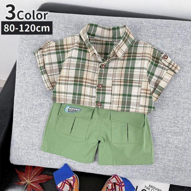 セットアップ 2点セット 上下セット キッズ 子供服 半袖シャツ ハーフパンツ 半ズボン チェック柄 ロールアップ袖 カジュアル おしゃれ かっこいい