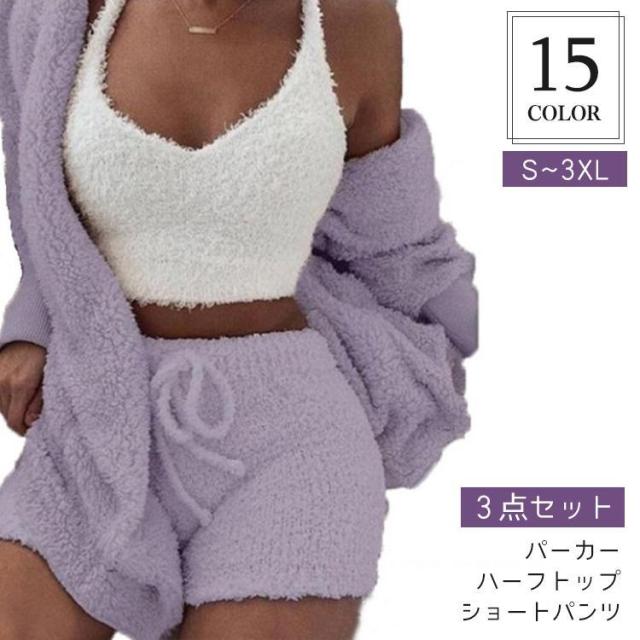 ルームウェア 3点セット レディース 部屋着 ハーフトップ ショートパンツ パーカー 大きいサイズ トップス ボトムス インナー 短パン 羽織り もこ