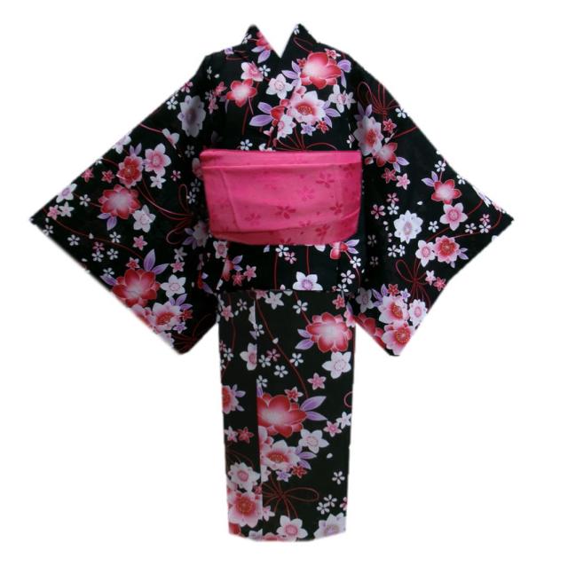 浴衣 セパレート 二部式 キッズ 兵児帯 2点セット 黒色地可憐花小桜結び紐 130cm 140cm 150cm 簡単着付け 子供用 ジュニア 女の子 女児 ゆかた へこ帯