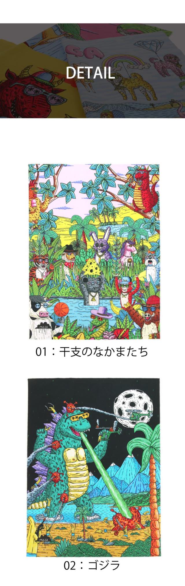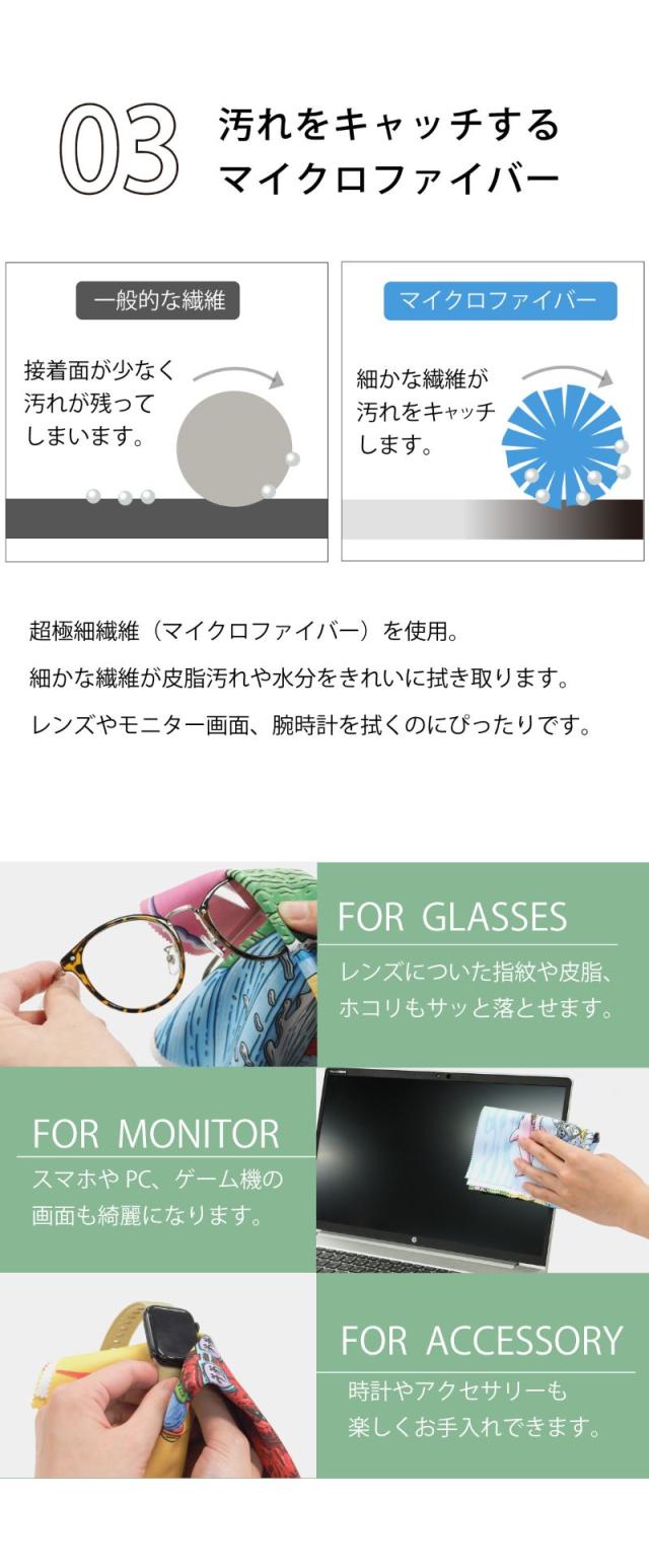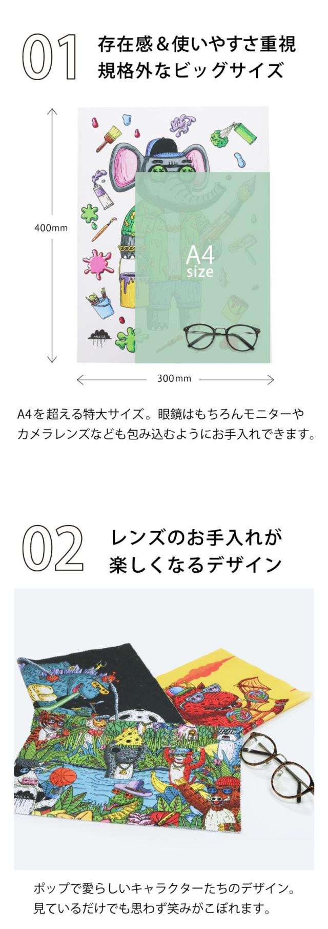 眼鏡拭きとしては規格外な特大サイズに、アート作品として楽しめる意外性は、プレゼントとして喜ばれること間違いありません。