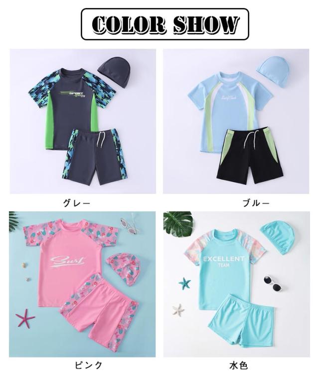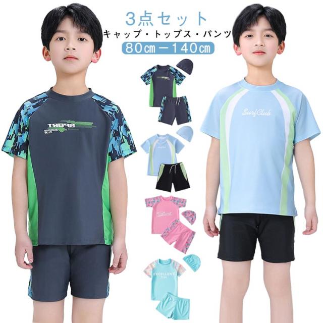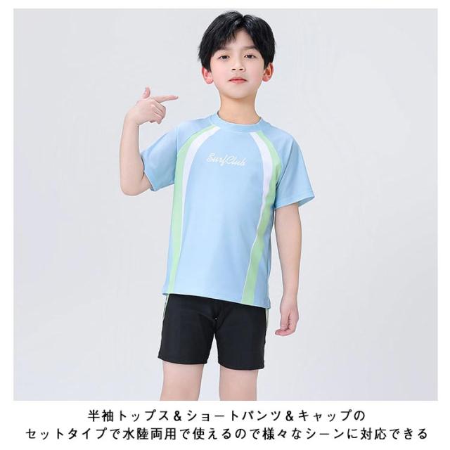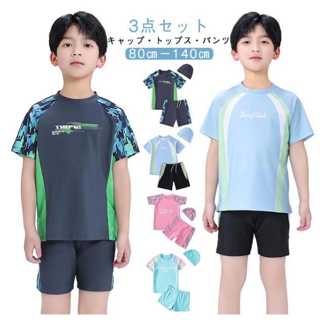 キッズ 水着 男の子 女の子 半袖 ラッシュガード パンツ 帽子付き 3点セット 夏 海 プール 90cm 100cm 110cm 120cm 130cm 140cm 子供 水着 セパレート 半袖トップス ハーフパンツ 上下セット UVカット ショートパンツ ベビー 小学生